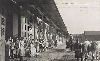 Bau des Schlachtviehmarkts — damals mussten die oft aus Ungarn kommenden Ochsen zum Verkauf noch bis zum Rindermarkt ans Stubentor getrieben werden. Es wurden Rinder, Schweine und Schafe gehandelt.